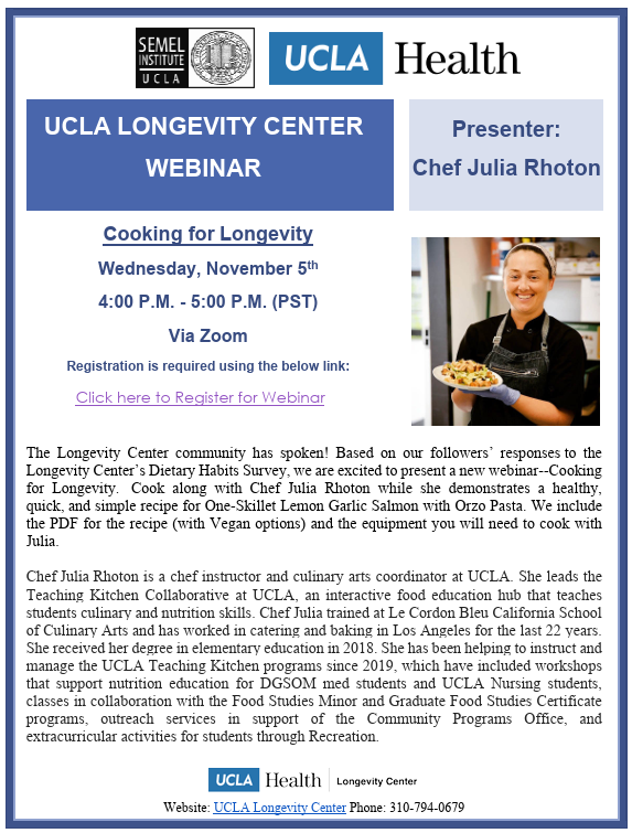 The Longevity Center community has spoken! Based on our followers’ responses to the Longevity Center’s Dietary Habits Survey, we are excited to present a new webinar—Cooking for Longevity. Cook along with Chef Julia Rhoton while she demonstrates a healthy, quick, and simple recipe for One-Skillet Lemon Garlic Salmon with Orzo Pasta. We include the PDF for the recipe (with vegan options) and the equipment you will need to cook with Julia.