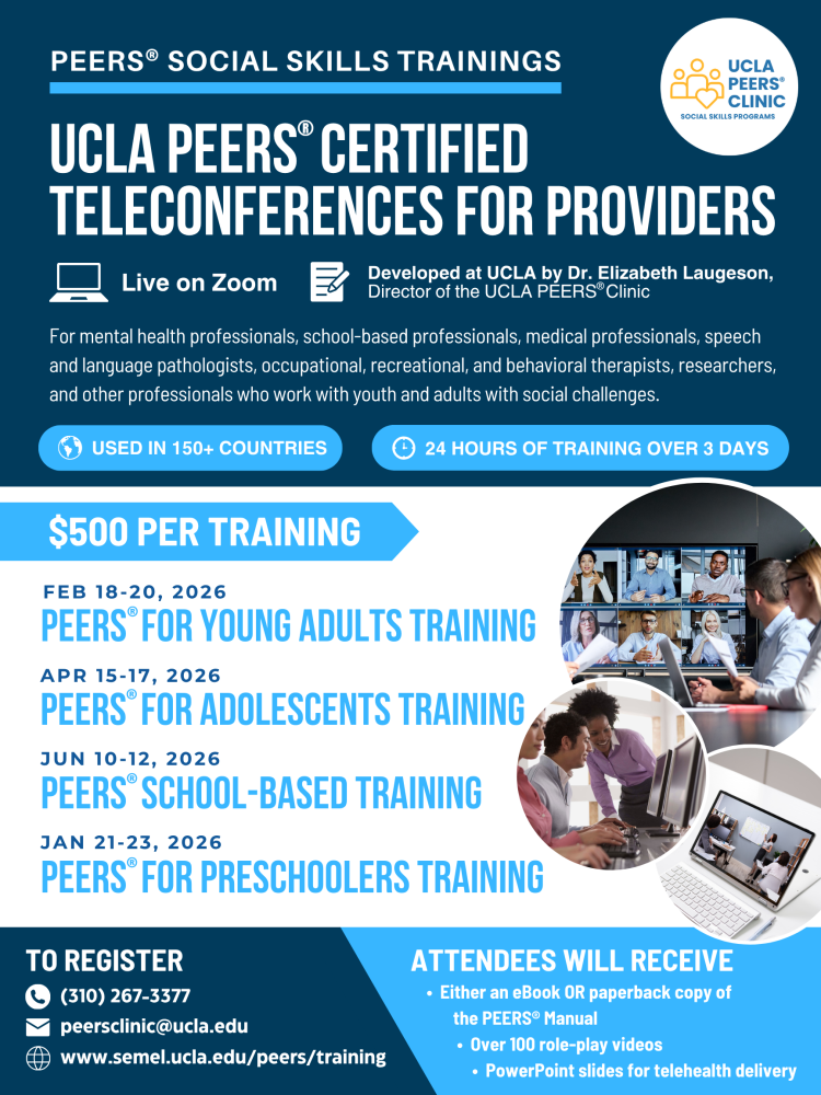 The UCLA PEERS® Clinic provides off-site certified training seminars, presentations, or workshops for a variety of organizations, school districts, universities, and other agencies based on their specific needs. These may range from 1-4 days, with varying costs. Please contact us at peersclinic@ucla.edu with inquiries.